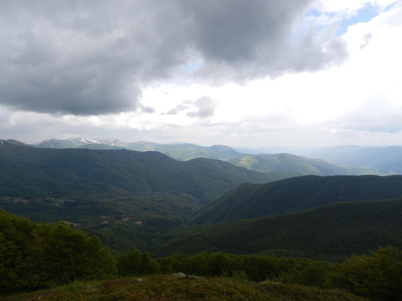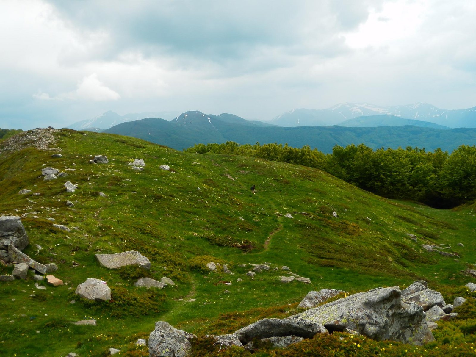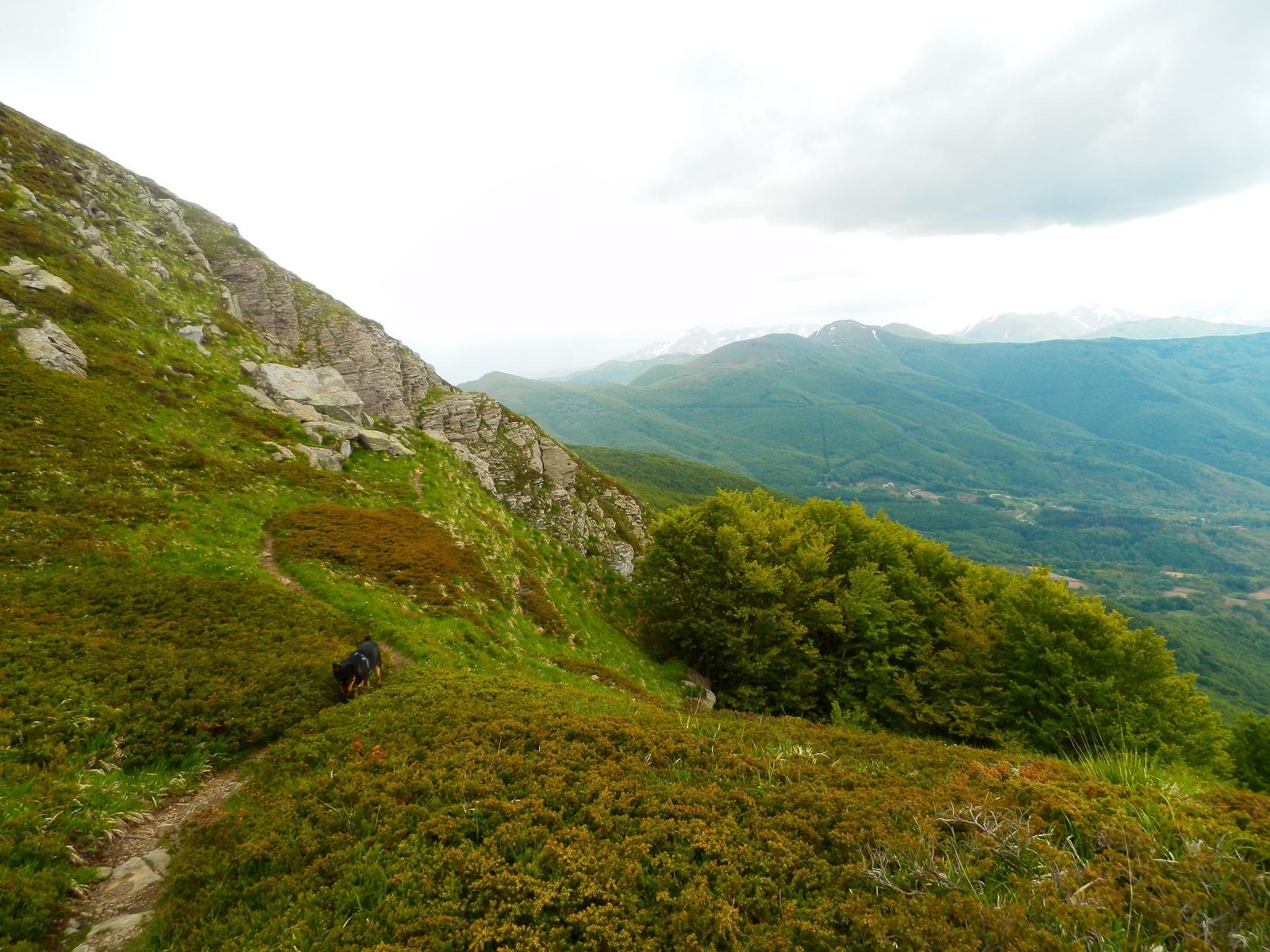 Trekking, lunghisssimo, partenza da Cerreto Laghi per il sentiero 649 che porta sul crinale reggiano, ad un certo punto non si sapeva più dove proseguire ed io e Thor abbiamo accorciato di un bel pò per fratte per arrivare sul crinale al sentiero 00 :) , attraversamento del crinale fino al P.sso del Cavorsella e discesa ad anello, il problema(sarà che la mia cartina ha 4 anni) è che il riconciungimento con il sentiero 649C non è per niente segnato al ritorno(almeno io non l'ho visto) ed abbiamo fatto il giro dell'oca risbucando da sotto il L.go Pranda, behh che dire, Thor si è visto anche i laghetti.C'è una deviazione che dal sentiero 647, senza arrivare a Cerreto Alpi, arriva al Lago Pranda e poi si sale fino a Cerreto Laghi e Lago Cerretano. In tutto abbiamo impiegato 7 ore con pioggia sul crinale dal passo di Cavorsella a scendere, nel complesso è un bel trekking completo anche di pioggia nei primi di Giugno ma ci vuole un pò di allenamento per farlo, causa sali scendi, ma è un bel trekking.Thor fa il Super-Dog ma è stanco anche lui questa sera ;) Alla prox avventura. L'altezza raggiunta non saprei dirla ma siamo circa intorno ai 1700-1730, quindi 700 metri di dislivello.